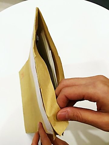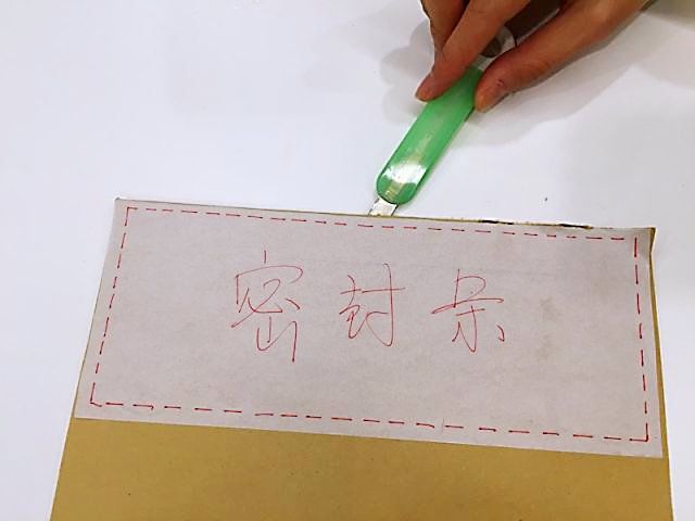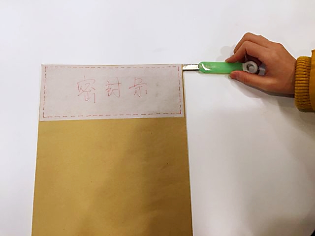 从信封一侧将小刀插进去,切一个小口,避开里面的舌头,沿着密封方向一点一点拆开